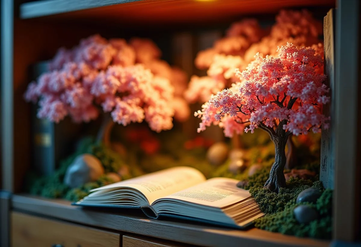 Les book nooks inspirés de la nature font partie des styles les plus prisés, avec des thèmes comme les cerisiers en fleurs (Sakura) qui évoquent la beauté et la sérénité de la culture japonaise. En parallèle, les univers fantastiques, inspirés de sagas telles que Harry Potter, séduisent également un large public. Le book nook manga japon est une autre variante très recherchée, combinant des éléments de la culture manga avec l’art du diorama.